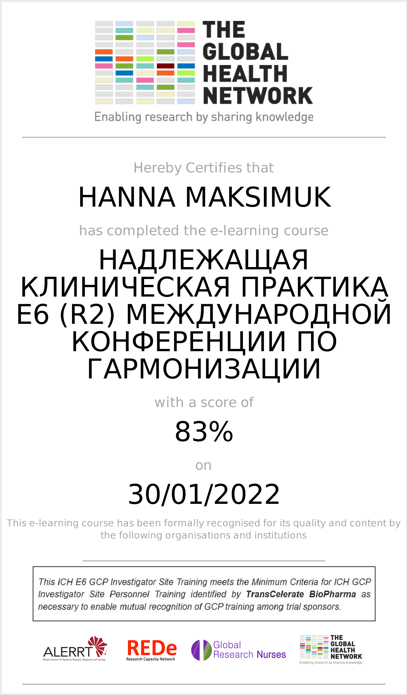 Прошла обучение с получением сертификата GCP (Good Clinical Practice)